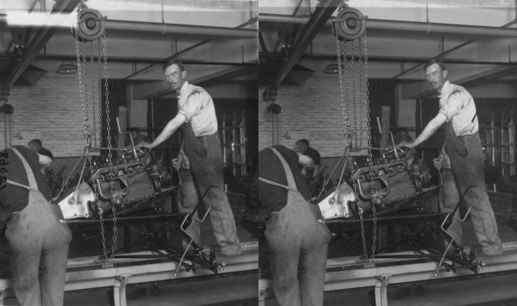 Henry Ford is generally credited with implementing the assembly line method for making cars but the historical truth is that a decade before Ford started up the line at the Highland Park Model T factory, Ransom Olds was putting cars together that way. Ford and his men, however, went a long way towards perfecting the assembly line. They first experimented building magnetos that way and once the concept was proven, it was expanded to assemble entire cars in 1913, reducing assembly time to a fraction of the time it took building cars with the former station assembly method. Model T enthusiasts tell me that the T in these Keystone-Mast stereograms is a 1914 model, which means these photos were shot very early in the Ford assembly line’s history.